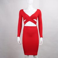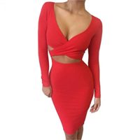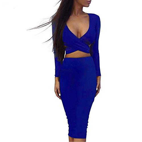 Title Figurbetontes Kleid Knielang, GRAVOG Sexy Fest V Ausschnitt Langarm Bodycon Kleid 2 teilig, Verschiedene Farben und Größen