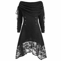 დProduktname: MYMYG Frauen Einfarbig Langarm Plissee Kragen Spitze Panel Dress Elegant Langarm Schulterfrei Bodycon Spitzenkleid Bündel Taille Party Wrap Maxi Minikleid Sexy A-Linie Swing Dress♫Produktinformation: ♫