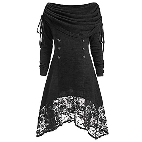 MYMYG Frauen Einfarbig Langarm Plissee Kragen Spitze Panel Dress Elegant Langarm Schulterfrei Bodycon Spitzenkleid Bündel Taille Party Wrap Maxi Minikleid Sexy A-Linie Swing Dress